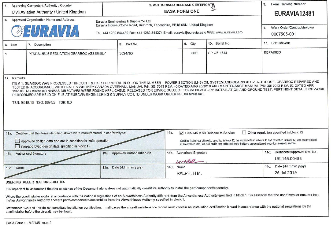 All work is performed in accordance with OEMβs applicable overhaul & maintenance manual revision, and certified as per UK CAA/ FAA/ EASA. (or other NAA certificates as per Euraviaβs NAA approvals).